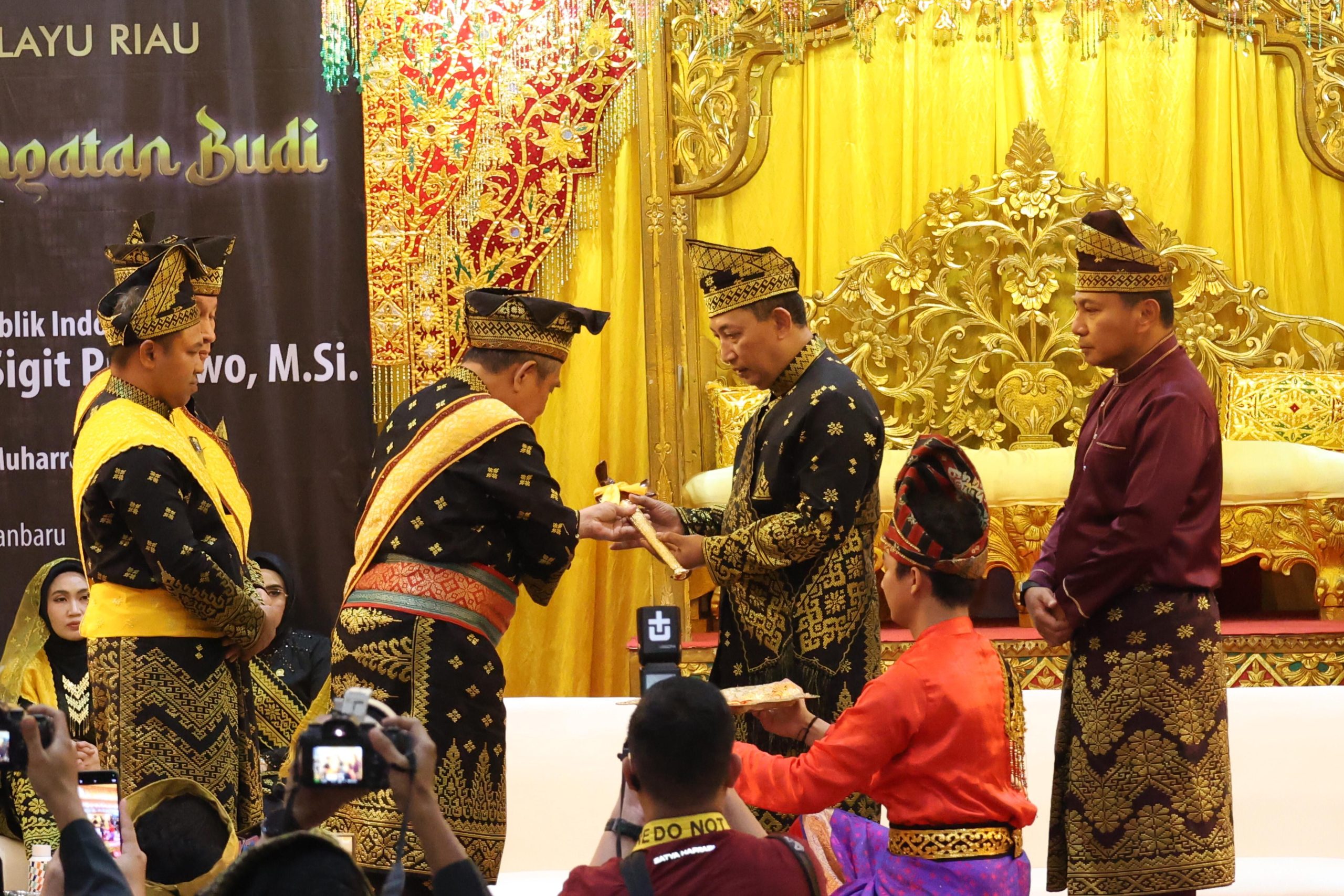 Pemberian Anugerah Adat Ingatan Budi digelar di Balairung Tenas Effendy Balai Adat LAMR, Sabtu (12/7/2025). Jenderal Sigit, Irjen Herry Heryawan, dan Abdul Wahid duduk di tempat prosesi adat (di depan peterakna).