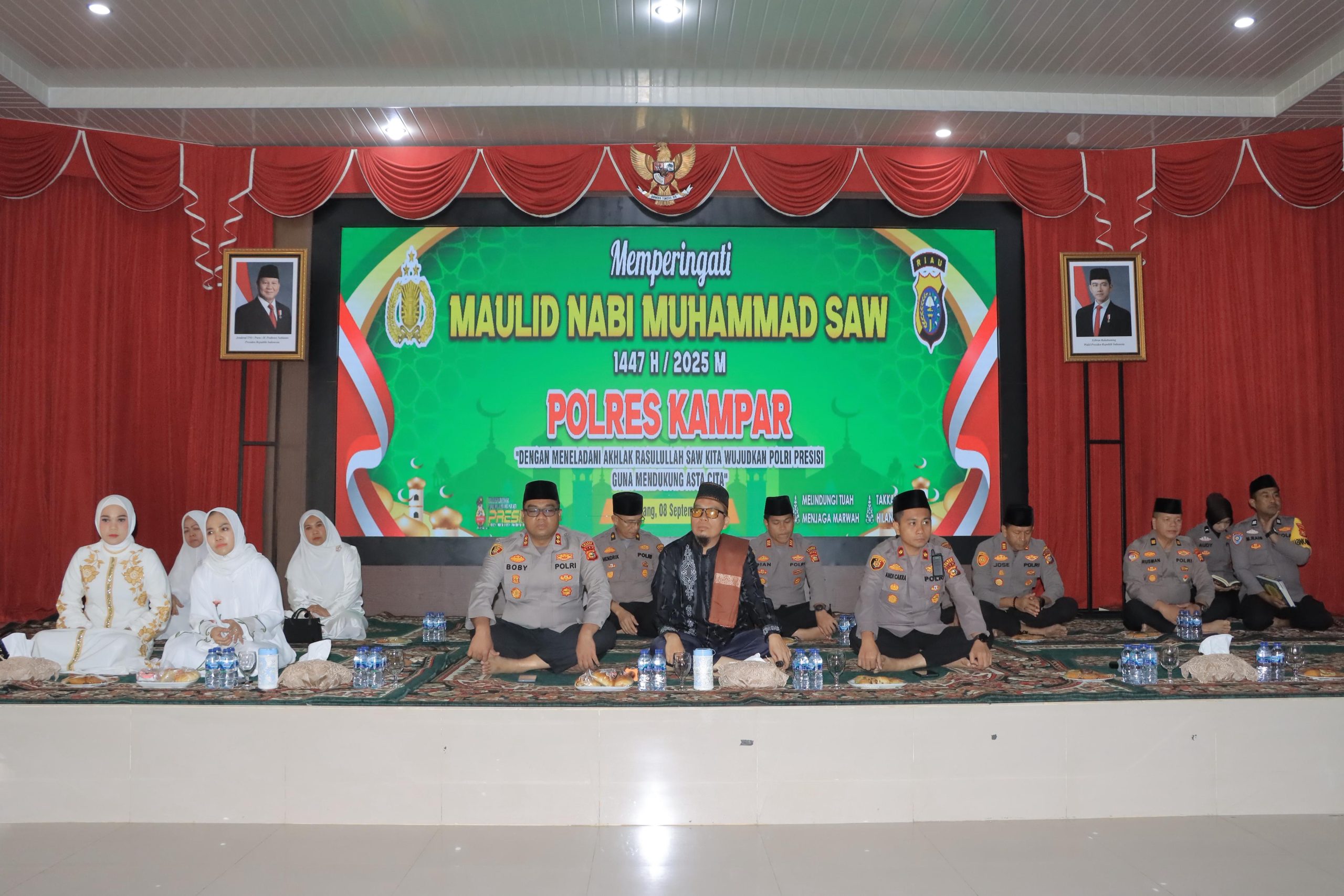 BANGKINANG, MisteriBicara.com – Polres Kampar menggelar peringatan Maulid Nabi Muhammad SAW 1447 H/2025 M dengan khidmat dan penuh makna di Aula Sanika Setyawada, Senin (8/9/25) pukul 08.00 WIB.