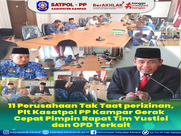Bangkinang, MisteriBicara.com – Sebanyak 11 perusahaan yang beroperasi di Kabupaten Kampar diduga tidak mematuhi aturan perizinan yang berlaku. Menyikapi hal tersebut, Plt. Kepala Satuan Polisi Pamong Praja (Kasatpol PP) Kabupaten Kampar, Zamhur, ST, MM, langsung menggelar rapat bersama Tim Yustisi dan sejumlah Organisasi Perangkat Daerah (OPD) terkait, Rabu (1/10/2025) di Aula Praja Wibawa Satpol PP Kampar.