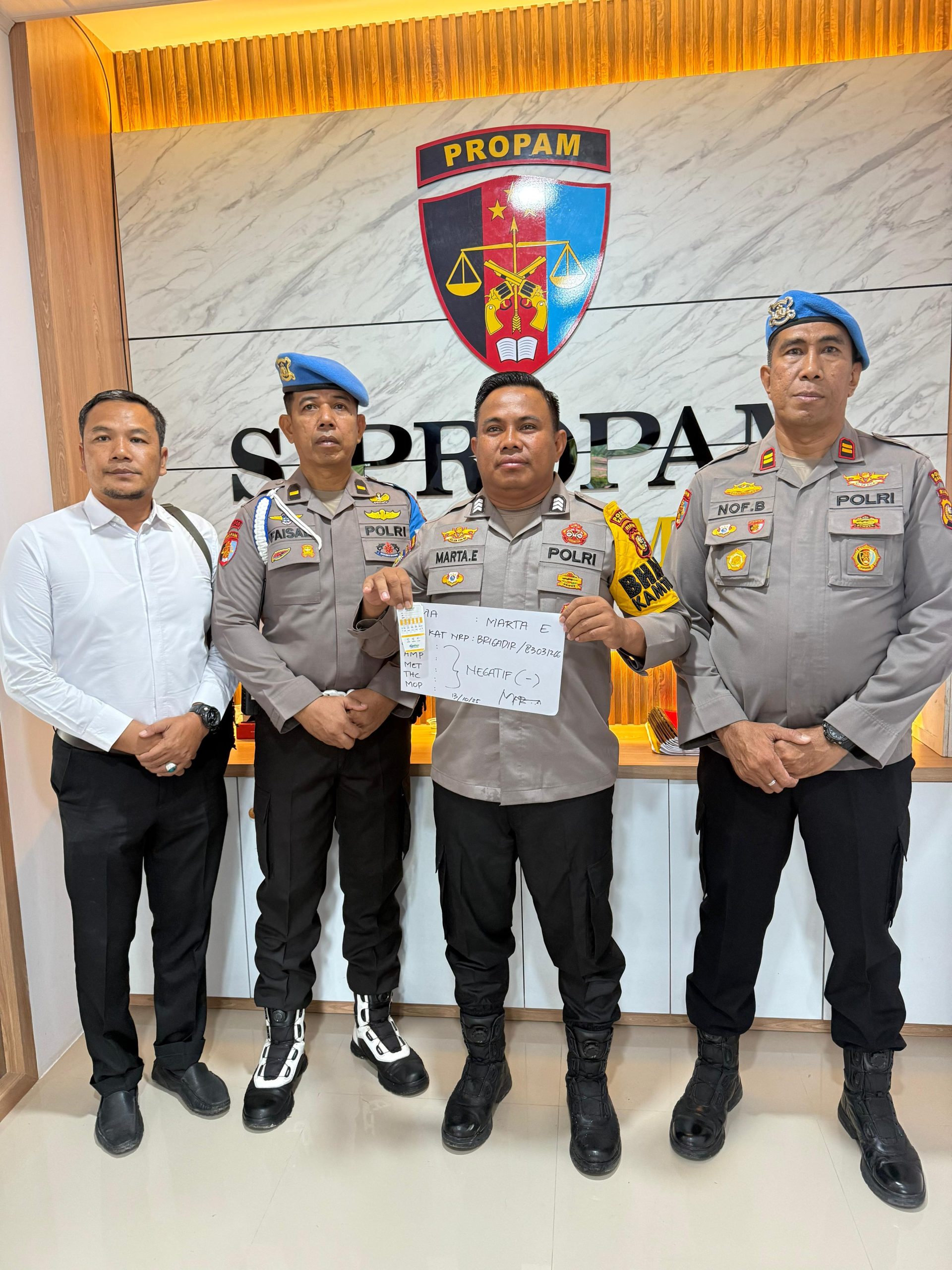 “Hasil pengecekan urine menunjukkan bahwa Brigadir Marta E negatif (-) mengandung Met Amphetamine. Hal ini membuktikan bahwa informasi yang beredar di media sosial tersebut tidak benar,” tegas Kasipropam.