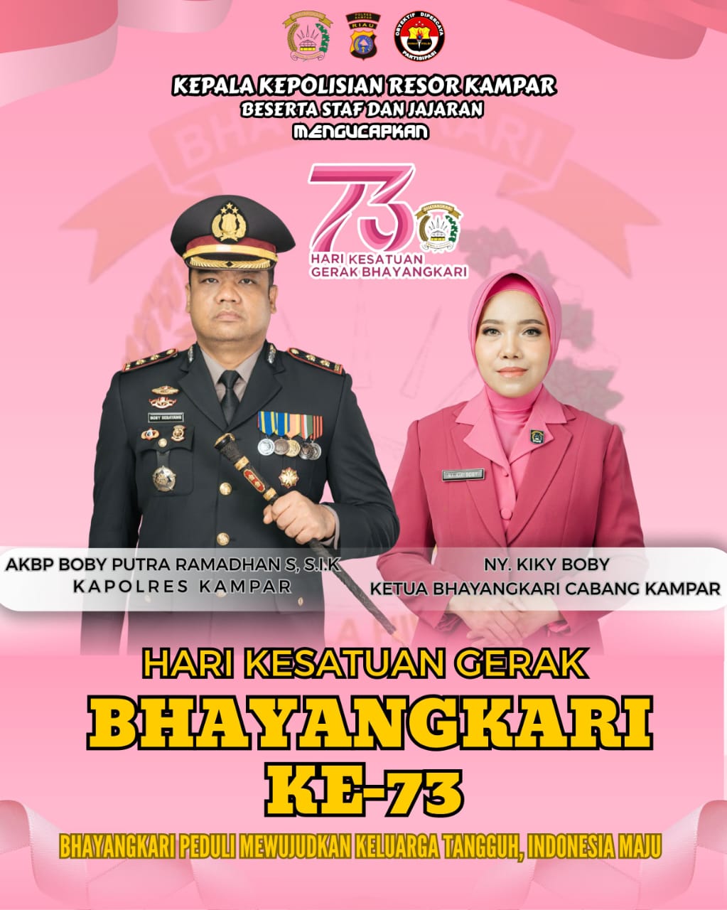 Kapolres Kampar, AKBP Boby Putra Ramadhan S, SIK, bersama Ketua Bhayangkari Cabang Kampar, Ny. Kiky Boby, menyampaikan ucapan selamat dan apresiasi atas peran serta Bhayangkari dalam mendukung tugas kepolisian serta membangun keluarga yang kuat dan harmonis pada hari minggu (19/10/25).