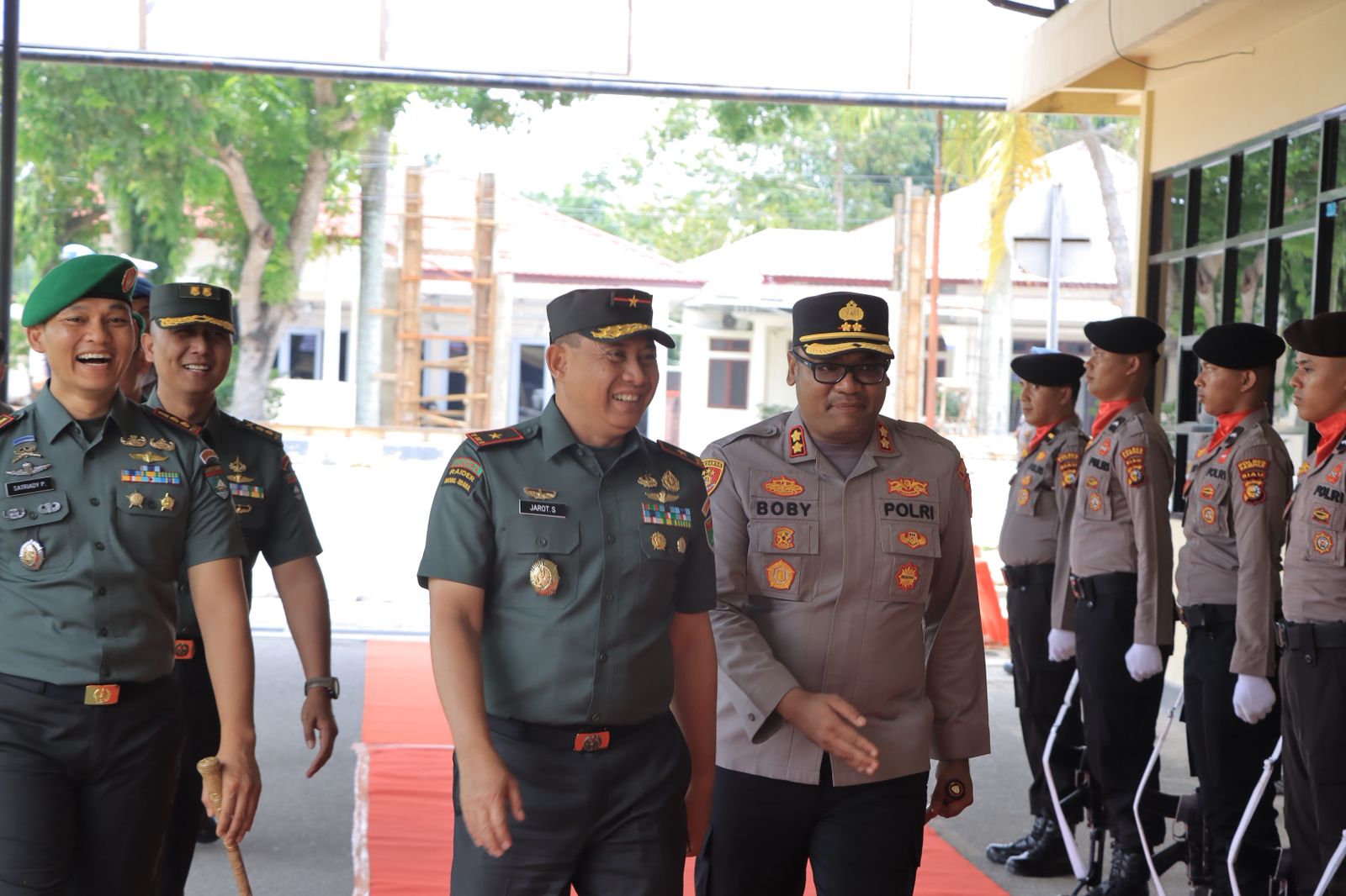 Kedatangan Brigjen TNI Jarot Suprianto beserta rombongan disambut hangat oleh Kapolres Kampar AKBP Boby Putra Ramadhan S, dengan jajar hormat di depan penjagaan Polres Kampar.