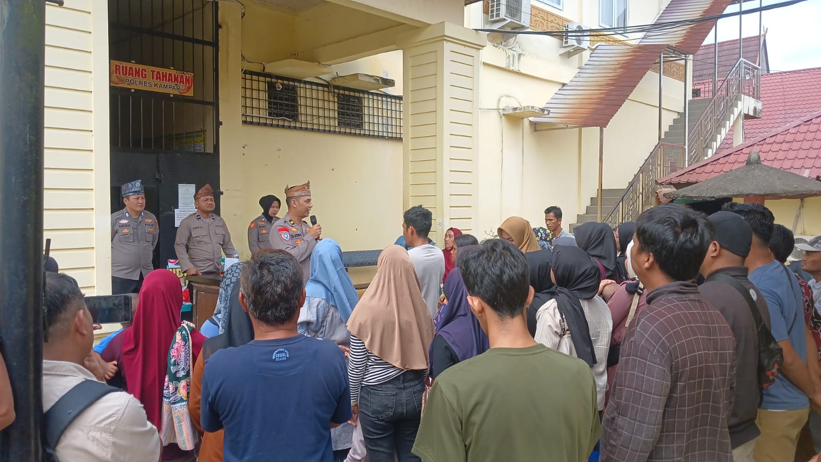 Kasat Tahti IPTU Joko Sumarno bersama 5 (lima) personel Sattahti dan 2 (dua) personel bantuan PAM satfung, menyambut para keluarga pengunjung yang datang untuk membesuk tahanan di Rutan Polres Kampar.